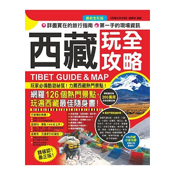 詳細資料ISBN:9789865755300 叢書系列:龍時代 規格:平裝 / 324頁 / 17 X 21 CM / 普通級/ 全彩印刷 / 初版 出版地:台灣 內容簡介 開篇先綜覽西藏全貌,概述西藏全境地理、氣候、行政區劃、人口與民族、節日慶典、交通、飲食、購物、精彩行程推薦。 最熱門地點搶鮮看!涵蓋布達拉宮、大昭寺、八廓街、小昭寺、拉薩河、藥王山、羅布林卡、羊八井、甘丹寺、雅魯藏布江、古格王朝遺址、納木錯、墨脫、那曲、念青唐古拉山、羊卓雍湖、然烏湖、聖母峰等熱門地區,絕對不容錯過! 各景點、餐廳、咖啡館與酒吧均附「HOW攻略」專欄,詳列地址電話、交通、貼心小提醒、推薦星級(3-5顆星)、交通便利性(3-5顆星)。 全書網羅了126個熱門景點,書後附有景點、餐飲等名詞筆畫索引,方便讀者快速查閱。本書特色 最新、最實用的暢遊西藏全攻略,跟團或自由行都可參考查閱,讓你玩得盡興。 星等分級,真誠推薦陝西人氣必遊景點!人氣美食!人氣伴手禮! 本書全部資訊均經實地考察核實!西藏地理、氣候、交通、節日資訊、簽證、出入境指南、實景照片、地址、電話、門票、地鐵、公車線路全掌握! |